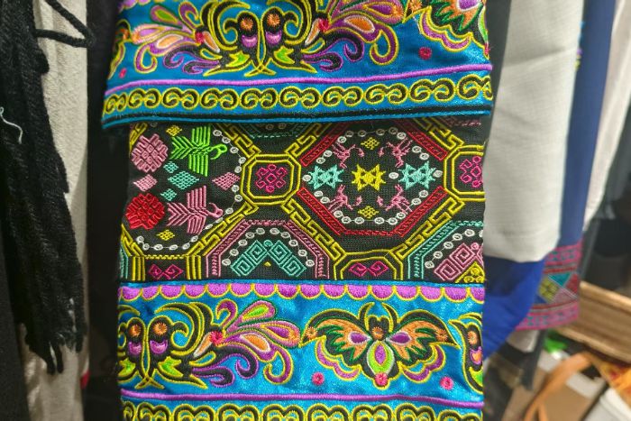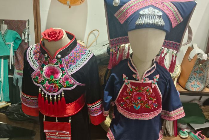 實踐期間,志愿隊以薩瑪非遺生活館為重要調(diào)研陣地,對傳承人洛塵老師展開深度采訪。洛老師為柳州市非物質(zhì)文化遺產(chǎn)項目侗族大歌第五代傳人、薩瑪非遺生活主理人,在民族文化傳承領(lǐng)域積累了豐富經(jīng)驗。交流中,志愿隊成員圍繞壯族服飾展開細致探究,從款式色彩的搭配邏輯到裝飾紋樣的文化隱喻,深入挖掘“稻穗紋”象征豐收祈愿、“蝴蝶紋”承載民族創(chuàng)世記憶與感恩自然等文化內(nèi)涵。洛老師同時分享了壯族服飾背后的民間傳說:古代壯族先民借衣襟紋樣傳遞御敵信息,形成“密碼式”刺繡;百褶裙褶皺數(shù)量與女子勤勞程度掛鉤,使服飾成為民族精神的鮮活載體。通過交流,成員對服飾與民族歷史、信仰的深層聯(lián)結(jié)形成認知。