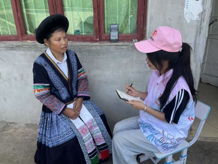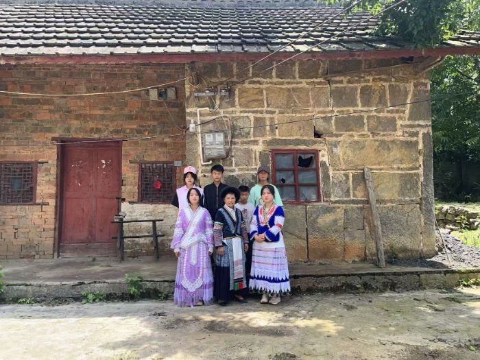 “家中苗語傳情,戶外普通話通意”——這是當?shù)孛缱逋纳畛B(tài)。受訪者談及語言時,眼中總透著通透:普通話是年輕人闖蕩外界的“船槳”,助其務(wù)工就學、銜接現(xiàn)代生活;而苗語是刻在血脈里的“印記”,飯間閑談、節(jié)慶歌謠里,都是祖輩智慧的回響。隊員跟著學了“內(nèi)給咯”(謝謝)等基礎(chǔ)表達,在村民的講解中才恍然:那些稱謂里藏著長幼有序的倫理,那些日常用語里凝著農(nóng)耕文明的積淀,語言從來都不只是交流工具,更是文化基因的“活載體”。