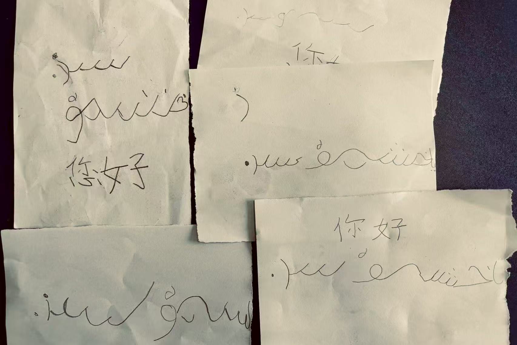 童謠學(xué)唱環(huán)節(jié)中,實踐成員以逐句領(lǐng)讀的形式,帶領(lǐng)孩子們跟唱簡易民族童謠。在最后的情景對話演練中,孩子們分組模擬日常問候場景,運用所學(xué)詞匯完成基礎(chǔ)交流互動,現(xiàn)場記錄顯示教學(xué)達(dá)成預(yù)期效果;顒邮展侪h(huán)節(jié),孩子們手持自行書寫的少數(shù)民族文字作品,與成員集體合影留存。