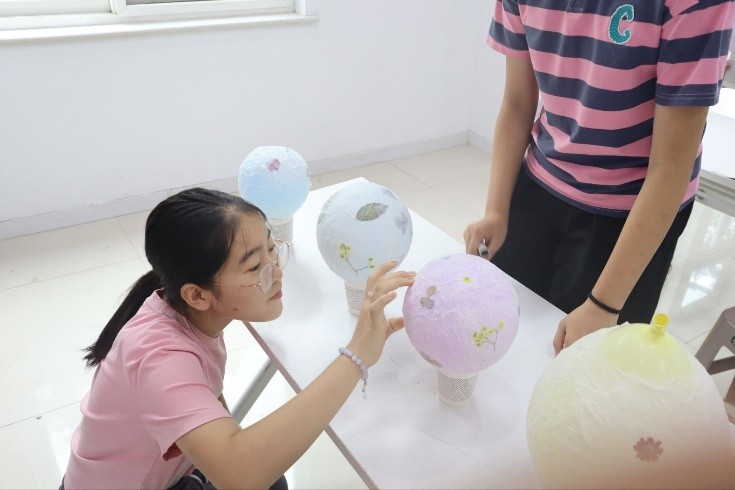 有幾位同學(xué)還巧妙地利用掉落的小花,在燈罩邊緣點綴出精致的裝飾,每一雙擺弄紙漿與花草的手,都在用心構(gòu)建著獨一無二的光影藝術(shù)品。