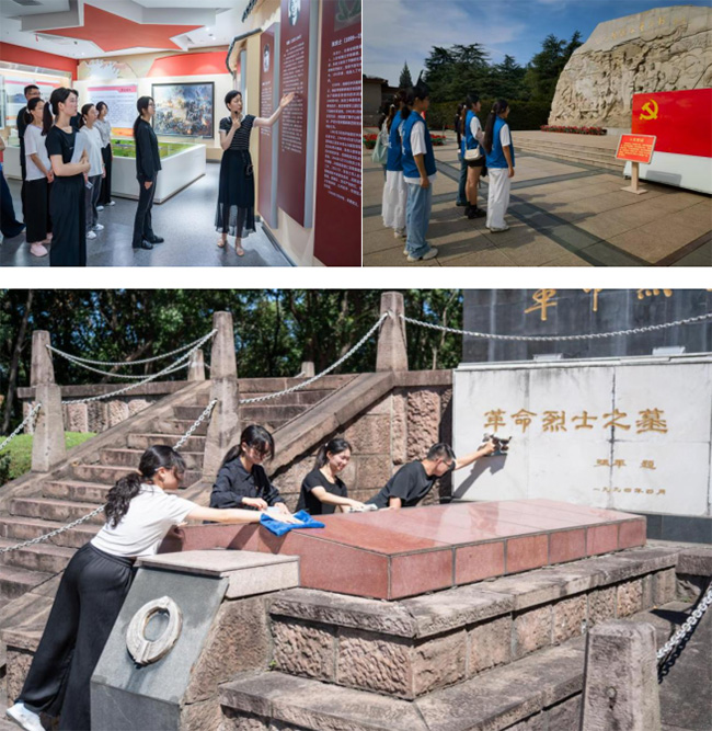 在蕪湖市烈士陵園與合肥市烈士陵園,志愿服務(wù)隊全體隊員整齊列隊,手持工具仔細為烈士擦拭墓碑,以莊重行動向英勇獻身的革命先烈表達深切緬懷與崇高敬意。在莊嚴(yán)肅穆的紀(jì)念碑前,隊員們宣讀入黨誓詞,鏗鏘有力的誓言回蕩空中,彰顯“青春挺膺正當(dāng)時”的堅定信念。通過沉浸式的現(xiàn)場學(xué)習(xí)與詳實動情的講解,隊員們深入了解了革命先輩的感人事跡,深刻體悟偉大抗戰(zhàn)精神的時代價值,進一步激發(fā)了愛國熱情與使命擔(dān)當(dāng)。