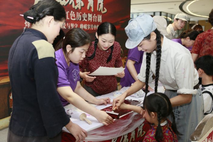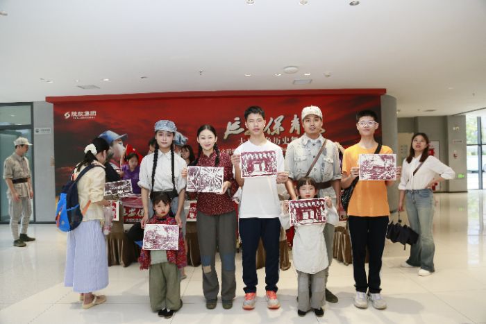 活動伊始,延安保育院大廳人頭攢動,實踐隊隊員提前準備好刻有革命故事、英雄形象的版畫模板,向參與活動的保育院工作人員、《延安保育院》舞臺劇演職人員及各地游客詳細講解拓印技巧。在隊員的耐心指導下,吸引了眾多游客,特別是帶著孩子前來觀劇的家長。萌娃踮腳刷墨,家長細心覆紙,滾輪輕壓間,一幅幅生動的革命畫卷在共同協(xié)作下誕生于素紙之上。過程中,不時有人交流拓印心得,分享圖案背后的紅色故事,“第一次體驗版畫,沒想到能親手‘復刻’歷史,帶回家就是最有意義的紀念!”一位家長興奮地展示著和孩子共同完成的作品。更令人驚喜的是,通過現(xiàn)場掃碼,AR技術讓靜態(tài)的版畫瞬間“動”了起來!英雄躍然眼前,故事栩栩如生,“哇!我的版畫活起來了!”的驚呼聲此起彼伏,參與者們手持完成的作品相互展示,現(xiàn)場氛圍熱烈而溫馨。