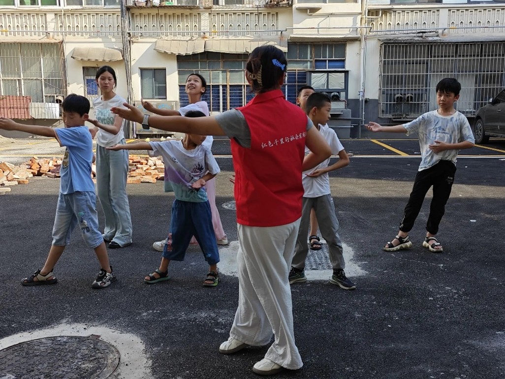 “左手如抱球,右手慢慢推......”在戶外場(chǎng)地上,志愿隊(duì)員帶領(lǐng)孩子們練習(xí)太極九式。他們解釋道:“紅軍用草藥強(qiáng)身,我們用太極健體,健康是革命的本錢。”一招一式間,傳統(tǒng)文化與紅色精神得到了完美融合。