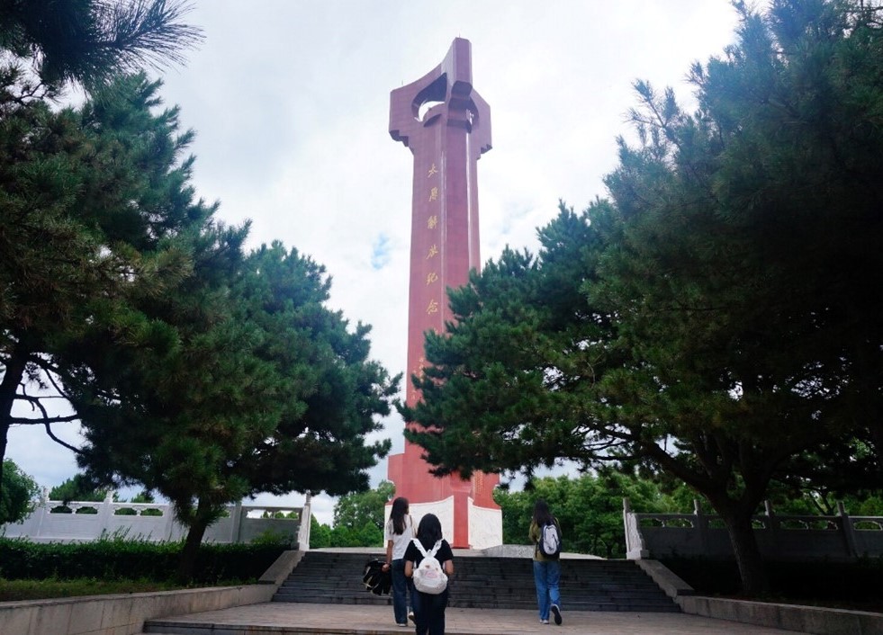 從全民抗戰(zhàn)的烽火歲月到解放山西的最后攻堅,實踐團的紅色足跡繼續(xù)向前延伸,最終走進太原解放紀念館。隊員們站在太原解放紀念碑前,目光不約而同地被那座紫紅色花崗巖主碑吸引。49.424 米的高度直聳云霄,徐向前元帥題寫的鎏金大字在陽光下熠熠生輝。隊員們駐足凝視,陽光透過縫隙灑在臉上,那一刻,碑體的沉默與青年的沉思交織,仿佛一場跨越時空的對話 —— 先輩用熱血鑄就的豐碑,正成為后輩心中不滅的精神坐標。