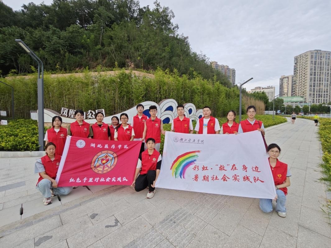 圖為紅色千里行與彩虹·“救”在身邊暑期社會(huì)實(shí)踐隊(duì)在鳳凰山公園前合影場(chǎng)景