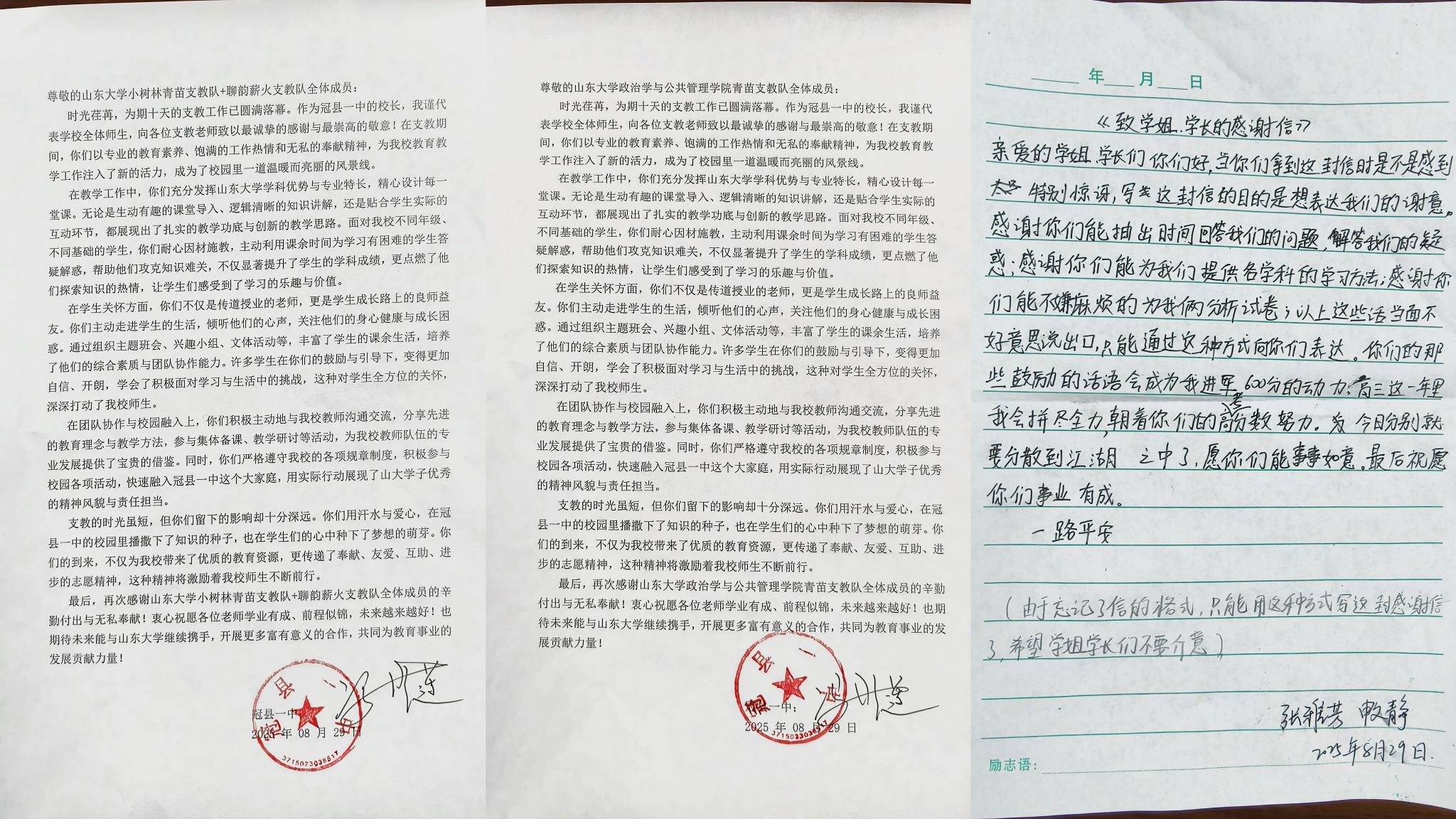 來自一中老師和同學(xué)們的感謝信。信中無不表達(dá)了對(duì)支教隊(duì)多日來付出的肯定,也期許未來能有山大學(xué)子們來到冠縣,為冠縣的孩子們帶來更多的分享,助力他們成長(zhǎng)。