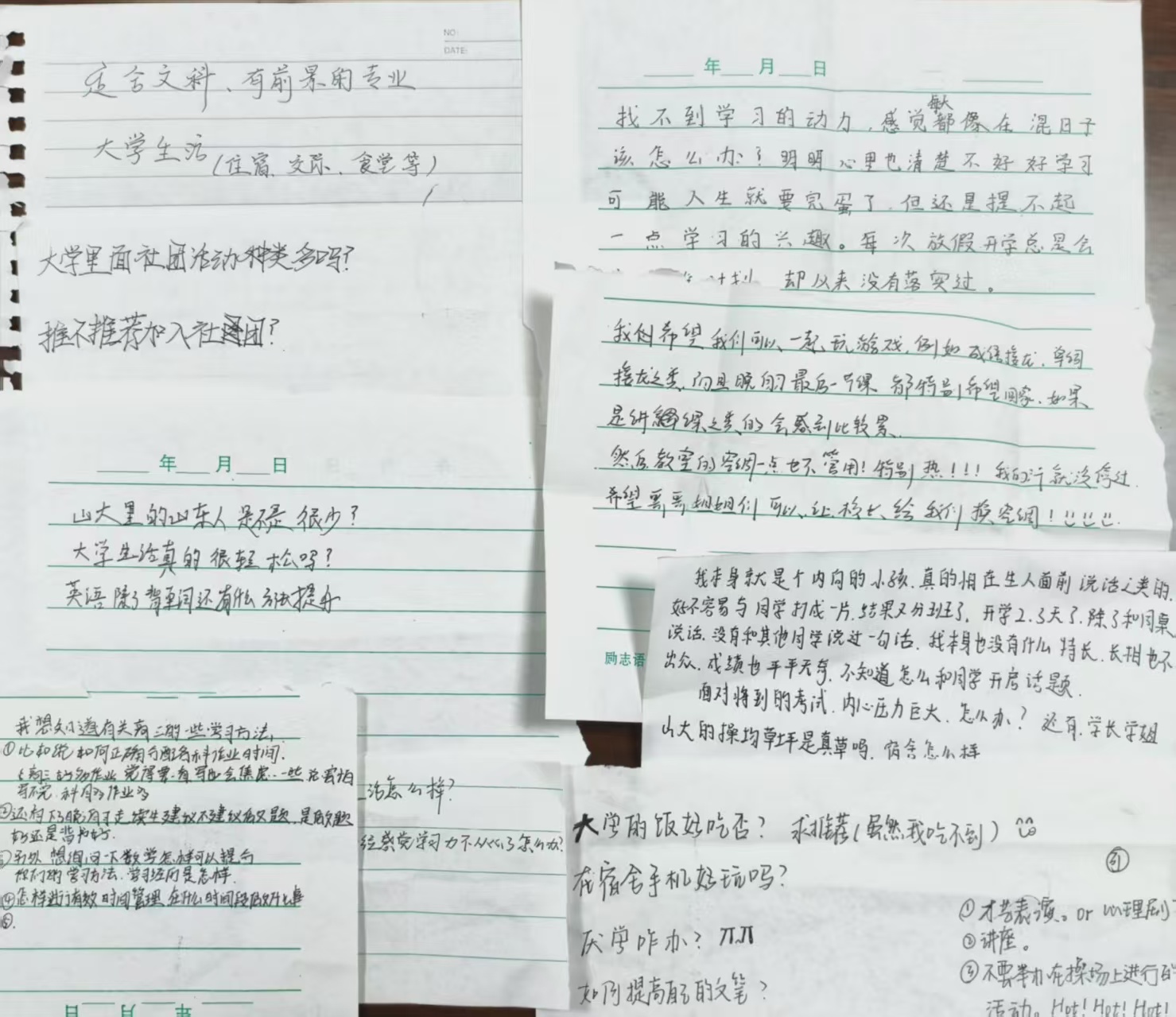 山東大學(xué)(青島)學(xué)生小樹林支教調(diào)研團(tuán)青苗支教隊(duì)和聊韻薪火支教隊(duì)的隊(duì)員們根據(jù)收集到的問題和反饋,精心設(shè)計(jì)了11份分享PPT,涵蓋了學(xué)科學(xué)習(xí)方法、大學(xué)生活、專業(yè)選擇、心理調(diào)節(jié)等多個(gè)板塊。在10天的時(shí)間里,隊(duì)員們?cè)诟鱾(gè)班內(nèi)開展分享會(huì),足跡遍布冠縣一中高三年級(jí)的22個(gè)班級(jí),覆蓋1700余名學(xué)子,有效解決了同學(xué)們的疑惑,助力他們合理安排復(fù)習(xí)計(jì)劃,盡快適應(yīng)高三節(jié)奏。