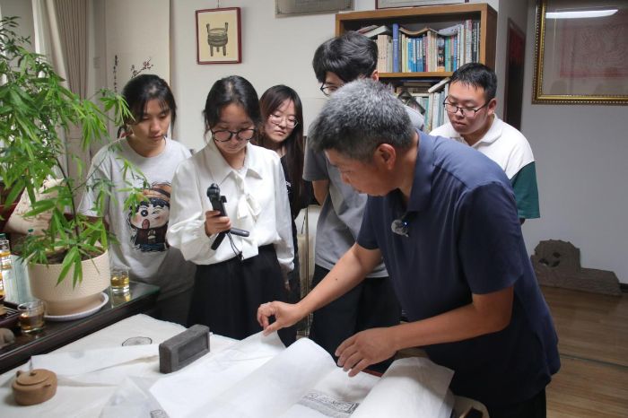 在訪談環(huán)節(jié),徐偉先生從家族傳承脈絡(luò)講起,細(xì)致講述了徐氏傳拓從祖輩初創(chuàng)到如今的發(fā)展歷程,他提到,傳拓看似是簡單的“復(fù)制”,實則暗含對文物的敬畏——不同材質(zhì)的石碑、青銅器,需要搭配不同韌性的紙張和調(diào)制比例的墨汁,甚至連捶打的力度都要根據(jù)紋路深淺精準(zhǔn)把控,稍有不慎便可能損傷文物原貌。這些藏在細(xì)節(jié)里的講究,讓隊員們第一次意識到,這項技藝不僅是手藝,更是對歷史遺存的溫柔守護(hù)。