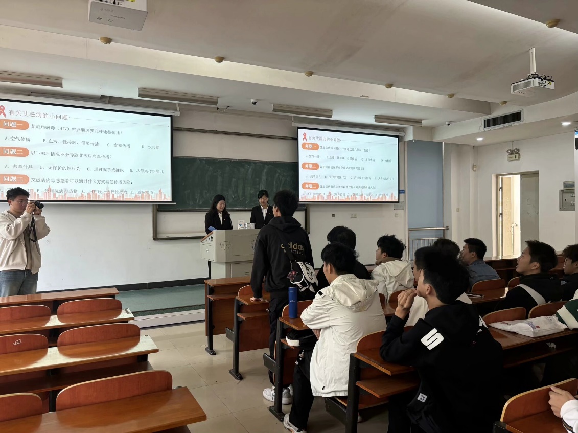 首先,許安琪同學(xué)通過播放一個(gè)有關(guān)艾滋病的宣傳視頻,使同學(xué)們對(duì)于艾滋病如何傳播及如何預(yù)防的知識(shí)有了初步的認(rèn)識(shí)。接著,許安琪同學(xué)從客觀科學(xué)的角度出發(fā),全面講解了艾滋病對(duì)于患者個(gè)人及家庭、社會(huì)的負(fù)面影響。同時(shí),她立足于大學(xué)生身份的特殊性,強(qiáng)調(diào)性傳播、血液傳播為艾滋病威脅大學(xué)生的重要途徑。隨后,她深入講解了預(yù)防艾滋病的方法以及如何正確對(duì)待艾滋病。為調(diào)動(dòng)現(xiàn)場(chǎng)聽講氛圍,宣講團(tuán)準(zhǔn)備了艾滋病知識(shí)問答的互動(dòng)環(huán)節(jié),同學(xué)們踴躍參與,回答正確率高,進(jìn)一步提高了宣講效果。