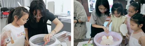青年學(xué)子們巧妙挖掘漆扇工藝中的哲學(xué)意蘊(yùn),將其與“雙向溝通”心理團(tuán)輔課程呼應(yīng),志愿者以“漆與水的對(duì)話(huà)”生動(dòng)闡釋?zhuān)?ldquo;色彩在水中交融碰撞,如同人與人傾聽(tīng)呼應(yīng)才能創(chuàng)造和諧。”孩子們屏息凝神,提扇入水,轉(zhuǎn)瞬吸附轉(zhuǎn)印出絢爛如極光、瑰麗似珊瑚的獨(dú)特紋路,在流動(dòng)的色彩中領(lǐng)悟溝通的真諦,實(shí)現(xiàn)了傳統(tǒng)工藝智慧與現(xiàn)代生活理念的創(chuàng)造性融合。
