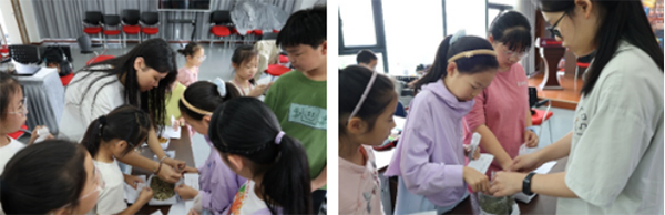 志愿者們精心設(shè)計(jì)了具象化的知識(shí)環(huán)節(jié):香囊課上引入“草藥鋪?zhàn)?rdquo;互動(dòng)游戲,讓孩子們化身“小藥師”開(kāi)方配藥;竹編課創(chuàng)新采用“童畫(huà)打底+竹編貼合”模式,巧妙降低技藝門(mén)檻,讓古老工藝煥發(fā)童真魅力。