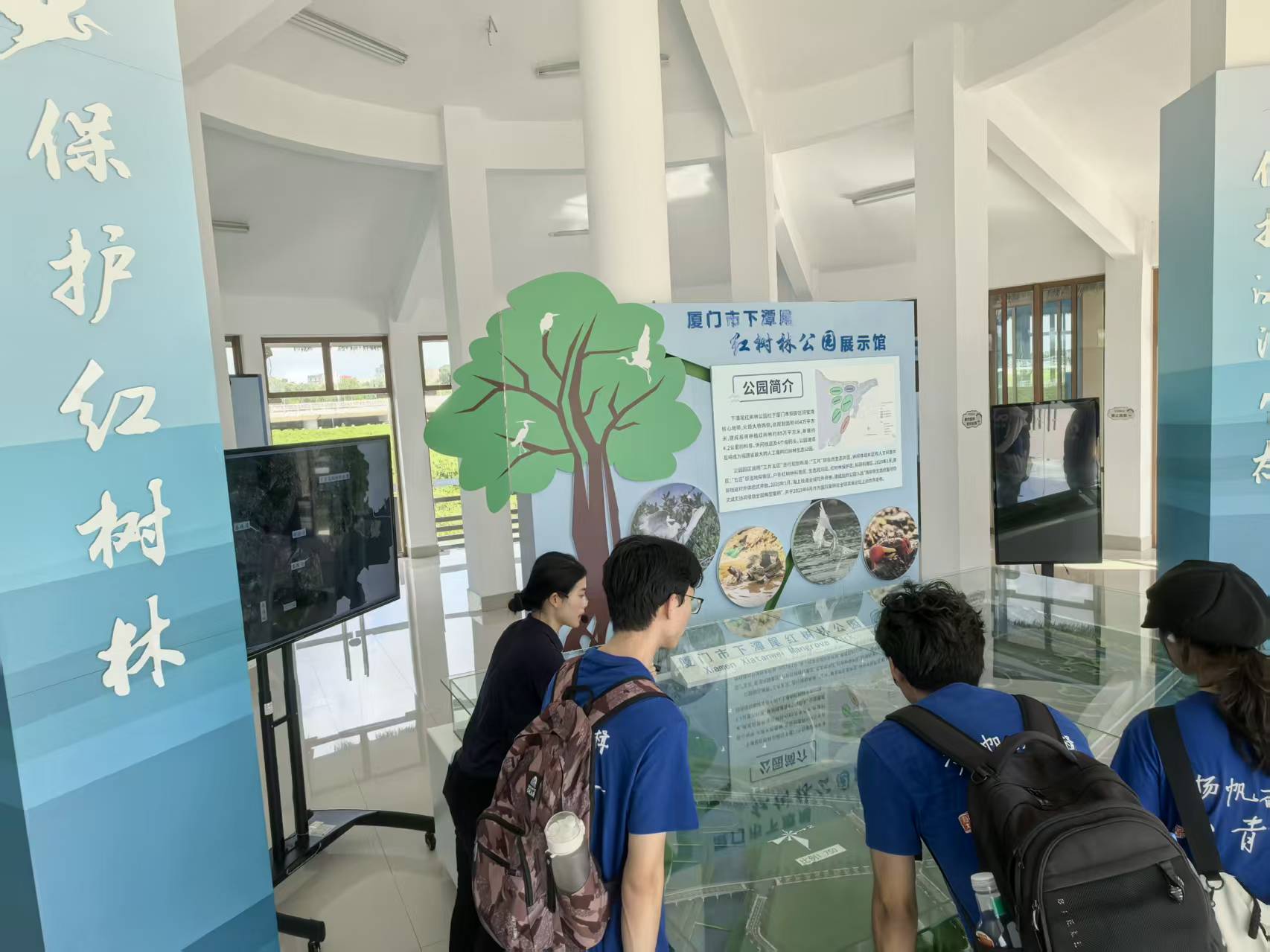 當日下午,實踐隊前往國家海洋生態(tài)修復(fù)示范工程廈門市下潭尾紅樹林公園開展調(diào)研。該公園每年固碳量可達450余噸,生長于潮間帶的紅樹林素有“海岸衛(wèi)士”之稱,其盤根錯節(jié)的發(fā)達根系和茂密枝體能有效發(fā)揮防沙消浪、促淤保灘、凈化海水等生態(tài)作用。當日凌晨臺風“楊柳”過境,依托紅樹林的生態(tài)防護功能,公園得以安然無恙。