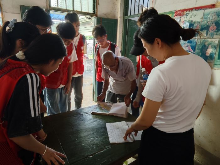 抵達韋柑爺爺家,隊員們先向村委工作人員了解其家庭情況,滿懷期待開啟交流。爺爺剛干完活換好衣服從里屋走出,92歲高齡仍堅持勞作的狀態(tài),讓隊員們由衷敬佩。