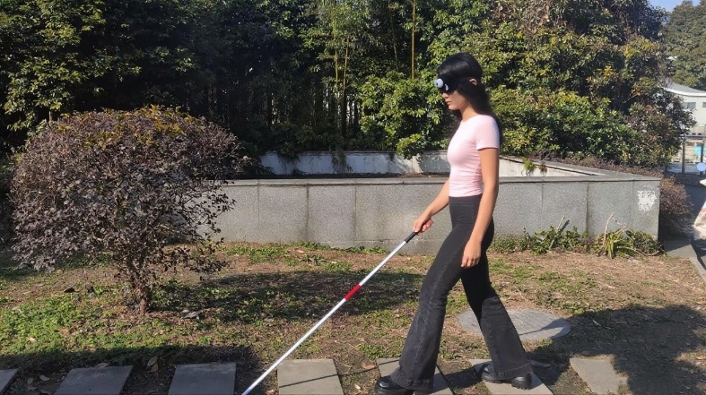 “紙上得來(lái)終覺(jué)淺”,為盡可能真實(shí)地模擬視障人士日常出行狀況,團(tuán)隊(duì)成員們戴上眼罩,手持盲杖,沿著清掃干凈的盲道行走。團(tuán)隊(duì)成員依靠盲杖敲擊路面發(fā)出的聲音分辨盲道方向,但由于周?chē)须s的環(huán)境和盲道的不平整帶來(lái)的巨大干擾,體驗(yàn)時(shí)頻繁出現(xiàn)偏離盲道路線、碰撞障礙物的情況,這更加堅(jiān)定了成員幫助視障群體改善出行環(huán)境的決心。