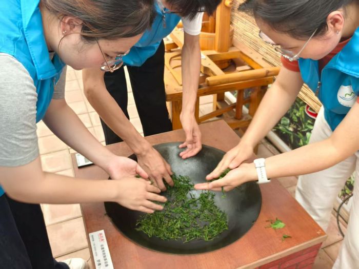 7月18日清晨,露水還凝在茶芽上,尹經(jīng)理已帶著我們走進(jìn)茶園。指尖掐住一芽一葉輕輕一提,嫩綠色的希望便落進(jìn)竹簍——這是我人生中第一次采茶,指腹沾染的茶香,比任何香水都更清冽。走進(jìn)制茶工坊,百年傳承的制茶工藝正在老師傅的手中流轉(zhuǎn)。攤晾臺(tái)上,鮮葉舒展著身軀,靜靜散發(fā)水汽;殺青鍋旁,高溫與茶葉碰撞出帶著草木香的白煙,師傅的手在鍋中靈活翻動(dòng),汗珠順著臉頰滑落,滴在青石板上洇出深色的印記;揉捻時(shí),茶葉在掌心漸漸成形,茶汁滲出的澀香里,藏著植物最本真的力量;最后一道干燥工序,將水分抽離的茶葉蜷縮成精巧的模樣,鎖住一整個(gè)春天的芬芳。尹經(jīng)理說:“這四步工序,少一步則香不醇,多一步則味過澀。”我們跟著學(xué)做綠茶時(shí),總在揉捻的力道上把握不準(zhǔn),老師傅便握著我們的手示范:“要像對(duì)待孩子似的,既要用力,又得心疼。”后來學(xué)做紅茶,看著茶葉在發(fā)酵中染上溫潤(rùn)的紅褐色,才懂得同一片葉子在不同工藝?yán)铮鼓芫`放出如此迥異的風(fēng)味。