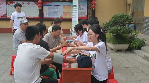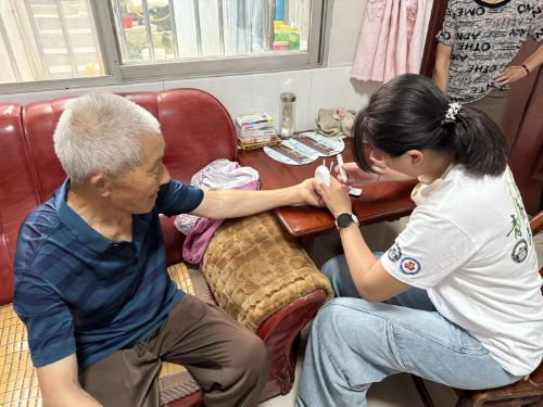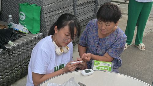 從童趣盎然的科普課堂,轉(zhuǎn)向直面鄉(xiāng)村健康現(xiàn)狀的實(shí)踐陣地,實(shí)踐隊(duì)員們將守護(hù)的“聽(tīng)診器”貼在了鄉(xiāng)親們的心坎上。在鞍山村黨員群眾服務(wù)中心前,實(shí)踐隊(duì)搭建起臨時(shí)健康宣教義診點(diǎn)。隊(duì)員們分組協(xié)作,嚴(yán)謹(jǐn)細(xì)致地為村民測(cè)量血壓、檢測(cè)血糖,同步發(fā)放圖文并茂的健康手冊(cè),并結(jié)合國(guó)家“全民減重”等政策導(dǎo)向,用通俗易懂的語(yǔ)言,向村民普及慢性病預(yù)防的核心知識(shí)。