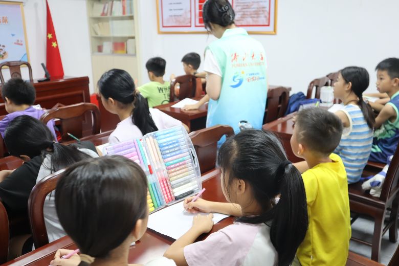 為增強(qiáng)地方文化自信,助力鄉(xiāng)村振興,7月10日,佛山大學(xué)人文學(xué)院“薪火之隊(duì)”義教組成員走進(jìn)德慶縣香山村黨群服務(wù)中心,為當(dāng)?shù)睾⒆觽儙砹艘惶贸錆M童趣與意義的繪畫課。