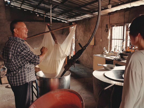 實踐團的首站深入幽居村村民家中,近距離觀摩、參與傳統(tǒng)豆腐制作的全過程。從豆子浸泡、石磨磨漿到柴火煮漿、點鹵成型,同學們被這份傳承的匠心所吸引。熱情好客的村民大媽邀請大家品嘗新鮮出爐的純天然豆?jié){,甘甜的滋味令人難忘。付瑞鈺同學感慨道:“豆?jié){健康又美味,但日復一日早起做豆腐真的很辛苦。大媽的熱情讓我們倍感溫暖,雖然我們堅持付了錢,但這份淳樸的鄉(xiāng)情是無價的。”聶詩瑩同學則敏銳地觀察到了鄉(xiāng)村產業(yè)的內生協(xié)作模式:“我們了解到村民之間形成了高效的接力合作。一戶人家完成鮮豆腐制作后,會直接供應給下一戶進行煎制,最終產品被帶到鎮(zhèn)上銷售。這種鄰里間的產業(yè)鏈條,是鄉(xiāng)村智慧的生動體現(xiàn)。”