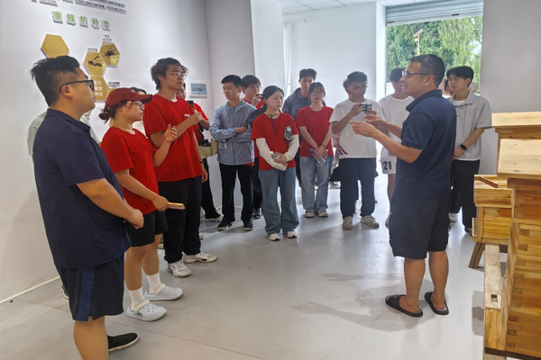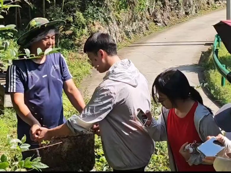 頂著炎炎夏日,實踐團走進村戶養(yǎng)蜂點,探訪銅鼓縣特有的珍貴農產品——樹參蜜。在經驗豐富的蜂農指導下,同學們驚喜地發(fā)現(xiàn)這里的蜜蜂性情溫順。盡管部分同學面對蜂群稍顯緊張,但大多數(shù)同學克服了心理障礙,展現(xiàn)出強烈的好奇心和勇氣,近距離觀察蜂巢結構,并親身參與了檢查蜂脾、搖蜜、取蜜等核心環(huán)節(jié)。當金燦燦、散發(fā)著獨特花香的樹參蜜從搖蜜機中緩緩流出時,現(xiàn)場充滿了收獲的喜悅和驚嘆。萬澤欽同學贊嘆道:“蜂蜜是大山深處人民手中結出的黃金。”