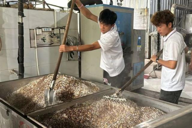 圖為實(shí)踐團(tuán)成員在負(fù)責(zé)人指導(dǎo)下混合蒸煮釀酒原料