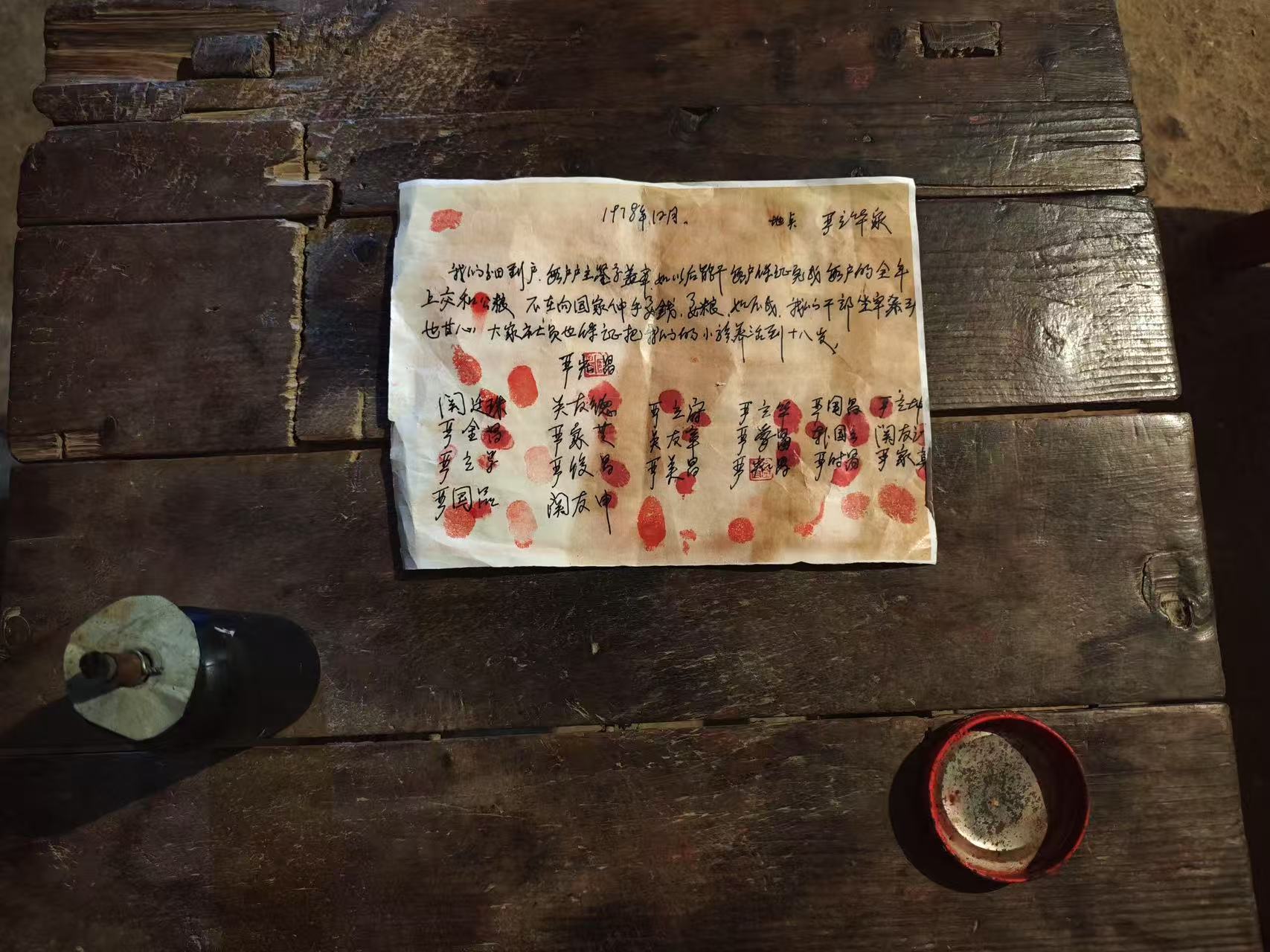 走進(jìn)“當(dāng)年農(nóng)家”,堂屋內(nèi)斑駁的土墻、缺了口的粗瓷碗、墻角生銹的農(nóng)具,處處透著歲月的痕跡。玻璃展柜中,復(fù)刻的“大包干”契約上,18個紅手印雖已褪色,卻依然清晰可辨。“簽契約時,大家約定‘如果村干部坐牢殺頭,其他農(nóng)戶要把他們的孩子養(yǎng)到18歲’。”