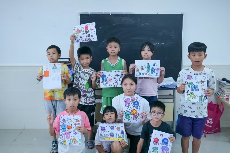 圖為隊員與孩子們展現(xiàn)繪制七彩水母作品,斑斕色彩鋪滿畫紙。林欣榕 供圖