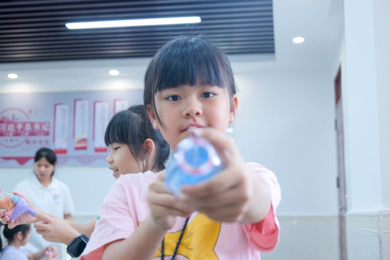 活動中,隊員們以多元形式傳遞知識與溫暖:美術(shù)課上,七彩水母在畫紙上綻放靈動光彩,粘土玫瑰在指尖綻放立體芬芳,彩繪蛋糕在色彩中勾勒甜蜜想象;創(chuàng)意實驗課里,塑料瓶與氣球變身“空氣炮”,一聲聲清脆響動點燃孩子們的探索欲。而“情緒特工隊”課程更顯用心,隊員們借助動畫片段,帶領(lǐng)孩子們認識快樂、悲傷、憤怒等五種基礎(chǔ)情緒,引導(dǎo)他們用語言表達內(nèi)心感受。