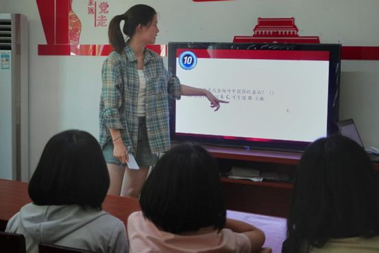 實踐團結(jié)合前期在插柳村開展的禁毒課程以及宣講會的內(nèi)容,設計了多個競賽板塊,涵蓋毒品危害辨識、禁毒法律法規(guī)解讀以及實用的自我保護技能等方面,為增加活動的趣味性和參與度,還將參與活動的學生分為三支隊伍,采用搶答競賽的方式展開活動。學生們在搶答中積極思考、踴躍發(fā)言,充分展現(xiàn)自己在禁毒知識方面的儲備,實踐團成員們針對題目進行同步講解,確保學生們真正理解并掌握相關知識。
