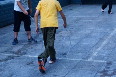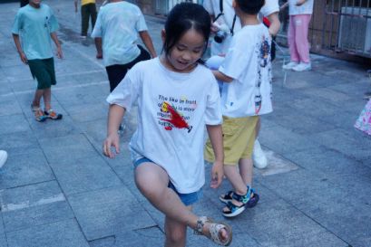 在運(yùn)動節(jié)環(huán)節(jié),實(shí)踐團(tuán)組織滾鐵環(huán)、跳房子、踢毽子等傳統(tǒng)游戲,吸引了眾多村民參與。70后家長熟練地展示推鐵環(huán)、踢毽子等動作,向孩子們講述兒時的運(yùn)動記憶。孩子們起初手法生疏,但在長輩的指導(dǎo)下逐漸掌握技巧,沉浸于游戲的快樂中。