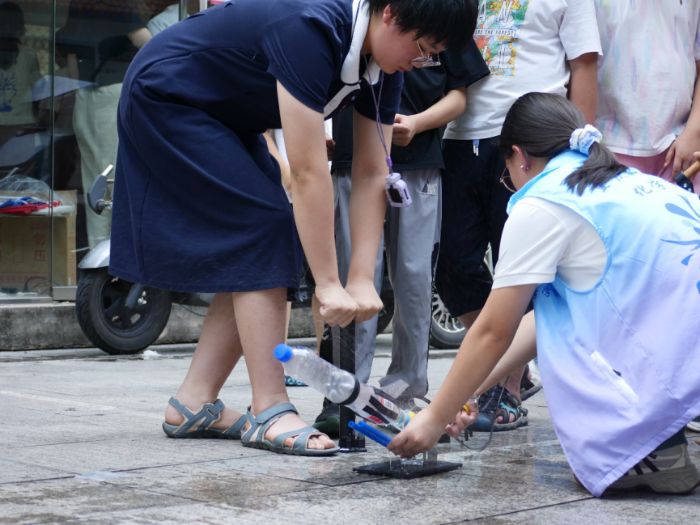 圖為實(shí)踐團(tuán)成員協(xié)助小朋友完成“水火箭”實(shí)驗(yàn) 黃焱坪 攝