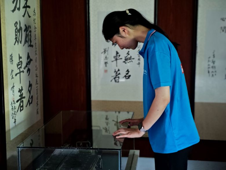 實(shí)踐團(tuán)成員依次參觀李克農(nóng)將軍生平事跡展陳。泛黃的書信、洗舊的衣物、質(zhì)樸的生活器具等珍貴文物,生動(dòng)再現(xiàn)了李克農(nóng)同志在隱蔽戰(zhàn)線上堅(jiān)守信仰、克己奉公的光輝歲月。復(fù)原的書房?jī)?nèi),一張斑駁的舊書桌與幾把原木椅構(gòu)成全部陳設(shè),展板上"生活上向低標(biāo)準(zhǔn)看齊,工作上向高標(biāo)準(zhǔn)要求"的箴言,恰如其分地詮釋了將軍嚴(yán)于律己的人生準(zhǔn)則,令在場(chǎng)師生深受觸動(dòng)。
