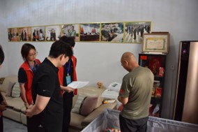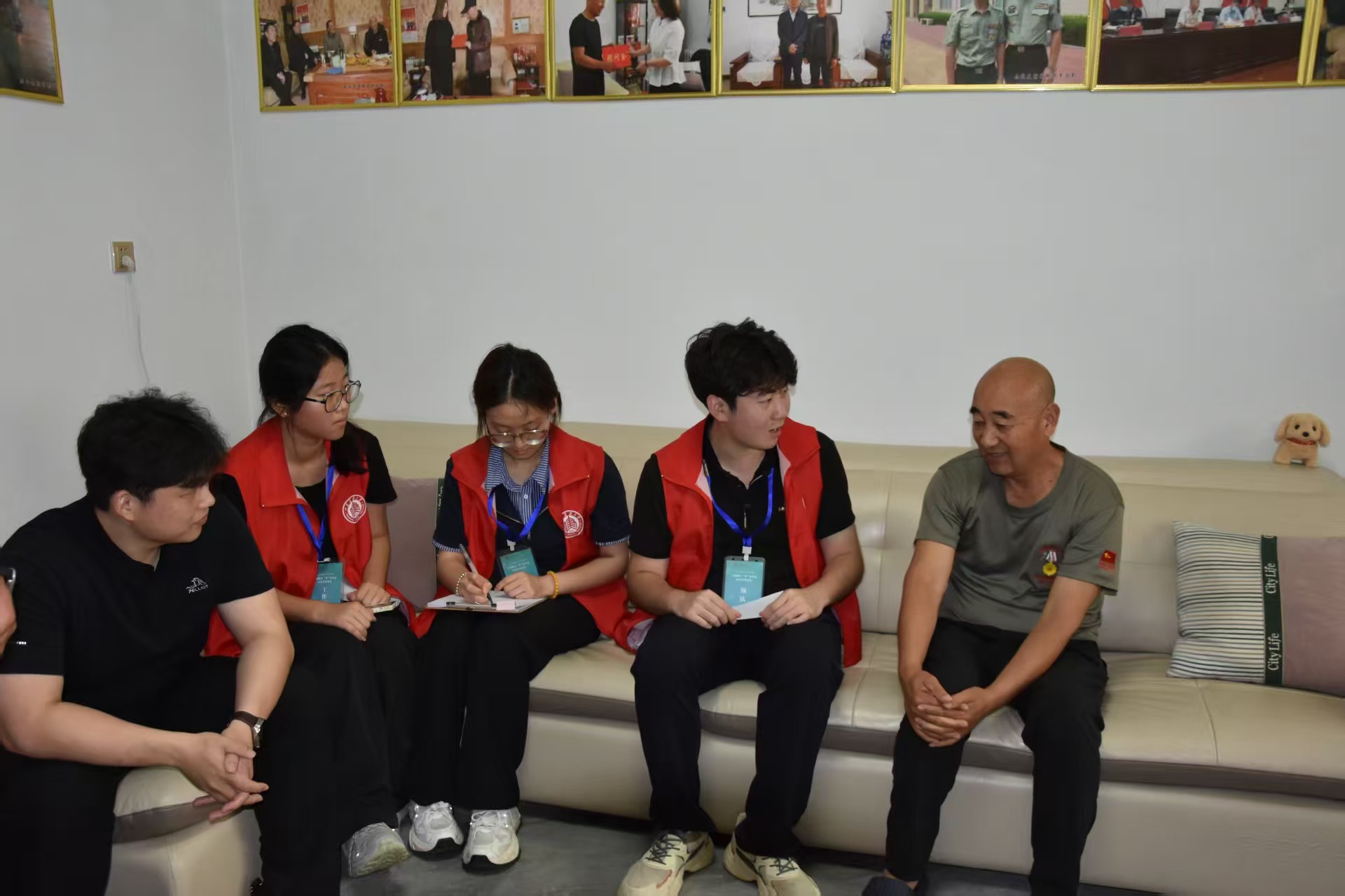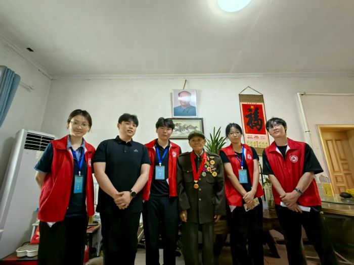 當(dāng)武老談及到當(dāng)年參戰(zhàn)時(shí)的經(jīng)歷時(shí),他神情激動(dòng),仿佛又回到了那個(gè)槍林彈雨的戰(zhàn)場(chǎng)。武老為團(tuán)隊(duì)成員細(xì)細(xì)述說了他參軍時(shí)的所見所聞,生動(dòng)描繪了那段波瀾壯闊的艱苦歲月,讓所有實(shí)踐團(tuán)隊(duì)成員為之動(dòng)容。隨后武老示意他的女兒拿出他的軍服,看到武老掛滿勛章的軍服后,團(tuán)隊(duì)成員雙眼一亮,被這身帥氣的衣服所折服,紛紛上前以便更清晰地欣賞這身軍裝。隨后武老換上掛滿勛章的軍服后,為團(tuán)隊(duì)成員逐一介紹了每枚勛章的由來。緊接著在團(tuán)隊(duì)顧問劉志浩的提議下,武老帶領(lǐng)團(tuán)隊(duì)成員中的黨員一起重溫入黨誓詞。當(dāng)“我志愿加入中國共產(chǎn)黨”的誓言從大家口中鏗鏘道出時(shí),武老眼中泛起的淚光與年輕黨員們堅(jiān)毅的眼神在空氣中交匯。每一個(gè)字都像帶著千鈞之力,撞在斑駁的墻壁上又反彈回來,在不大的房間里久久回蕩。這聲音里,有武老幾十載黨齡沉淀的赤誠,也有青年黨員們初入組織的熱血,一句句誓言串聯(lián)起跨越時(shí)代的信仰,讓紅色精神在新老交替的凝視中完成了一次無聲卻厚重的傳承。