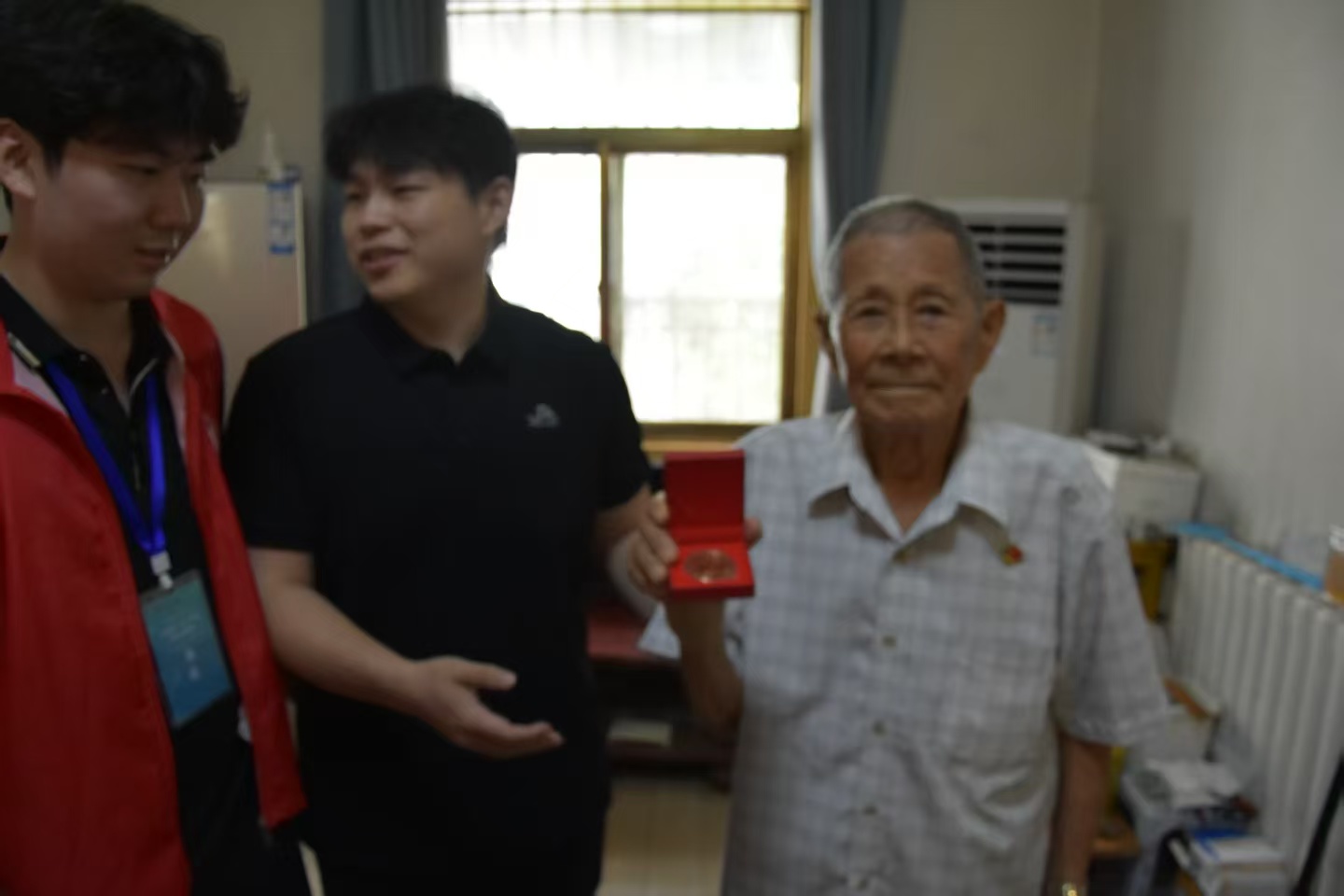 隨后經(jīng)武老的孫女了解到,今天恰逢武老的96大壽,團(tuán)隊(duì)成員為武老送上生日祝福并帶來了山東建筑大學(xué)紀(jì)念幣作為禮物,之后與武老合影留念,臨別時(shí),武老特意讓青年們圍在身邊,布滿皺紋的手輕輕拍了拍最前排一個(gè)年輕人的肩膀。陽光透過窗欞落在他花白的頭發(fā)上,映得那雙飽經(jīng)滄桑的眼睛格外明亮。他微微傾身,聲音因激動(dòng)而有些沙啞,卻字字清晰如叩擊磐石:“孩子們,記住我這句話 —— 一定要聽黨指揮,跟黨走,這是咱這輩子最該站穩(wěn)的根;一定要好好學(xué)習(xí),把本事練硬了,才能接好接力棒,讓咱的日子越過越紅火。” 說罷,他又挨個(gè)望了望在場(chǎng)的每個(gè)青年,目光里滿是期許,仿佛要將這份沉甸甸的囑托,通過眼神深深烙進(jìn)每個(gè)人的心里。