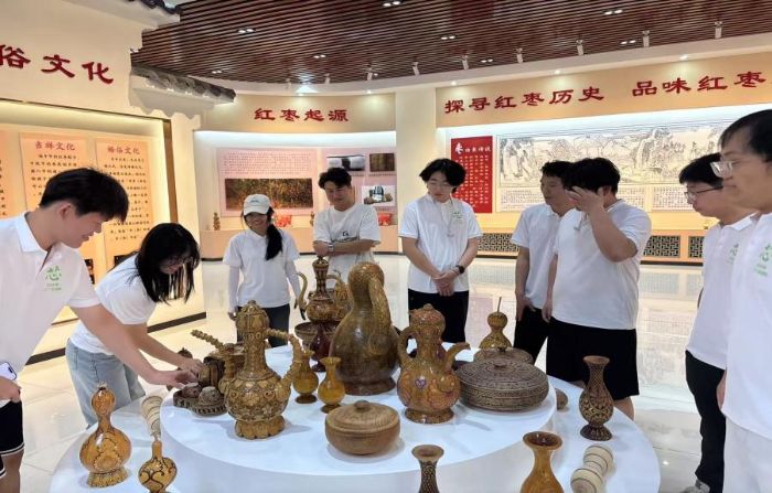 在文化展示環(huán)節(jié),開熱木拉·阿布都艾尼老師深入闡釋紅棗民俗文化,講述紅棗在新疆節(jié)慶、飲食、民俗中的重要象征意義。此外,還展示了古代用于盛放棗及制作棗制品的器皿,其中不乏造型精美的酒壺狀容器。這些器皿不僅體現古人以棗釀酒、制醬的智慧,更承載著千年棗文化的厚重底蘊,讓成員們深刻感受到紅棗不僅是農產品,更是傳承歷史的文化符號。