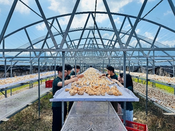 盧經(jīng)理帶領(lǐng)實(shí)踐隊(duì)成員進(jìn)入猴頭菇大棚,剛掀開棚簾,一股帶著濕潤(rùn)感的菌香撲面而來(lái)。盧經(jīng)理向隊(duì)員們介紹起猴頭菇的培育過(guò)程:菌袋制作的原料配比——接種后的溫濕度調(diào)控——成熟采摘的判斷標(biāo)準(zhǔn)。隊(duì)員們圍在一旁近距離觀察猴頭菇的生長(zhǎng)狀態(tài),有隊(duì)員問(wèn)起猴頭菇不同生長(zhǎng)階段的照料重點(diǎn),有的好奇病蟲害怎么防治。盧經(jīng)理為隊(duì)員們一一耐心解答,還拿起成熟的猴頭菇示范辨別品質(zhì)的方法。這場(chǎng)大棚里的“實(shí)踐課”,讓同學(xué)們對(duì)猴頭菇種植有了更鮮活的認(rèn)知,也真切感受到現(xiàn)代農(nóng)業(yè)技術(shù)的力量。