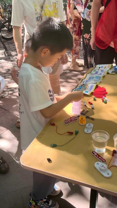 九點半,活動準(zhǔn)時啟動。社區(qū)負(fù)責(zé)人首先進(jìn)行簡要介紹,并向居民推廣活動內(nèi)容,引導(dǎo)更多小朋友與家長前來參與。隨后,志愿者帶領(lǐng)兒童輪流參與鹽水發(fā)電實驗,并向參與者發(fā)放獎品。