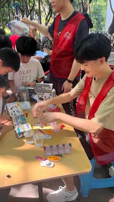 與此同時,第二隊志愿者在社區(qū)廣場開展用電安全宣傳。當(dāng)天上午8時,志愿者到達(dá)現(xiàn)場布置宣傳展板、實驗臺與互動區(qū)域,并準(zhǔn)備實驗材料、宣傳冊和小型獎品等物資。