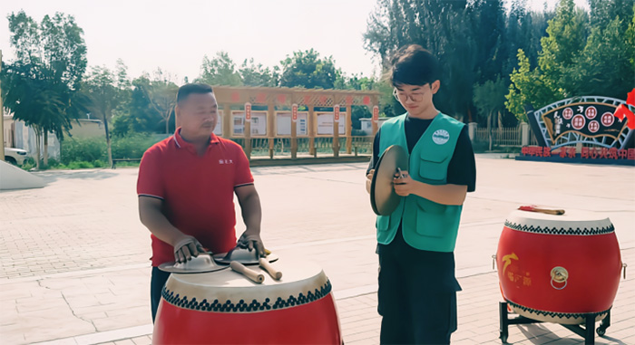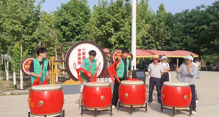 2025年7月7日,“藕”然遇“堿”“林”三下鄉(xiāng)實(shí)踐團(tuán)隊(duì)與阿拉爾市十六團(tuán)一營(yíng)一連工作人員齊聚一堂,以扭秧歌、敲紅鼓、打镲等紅色非遺體驗(yàn)為核心,共同排練節(jié)目,為后續(xù)演出做準(zhǔn)備。