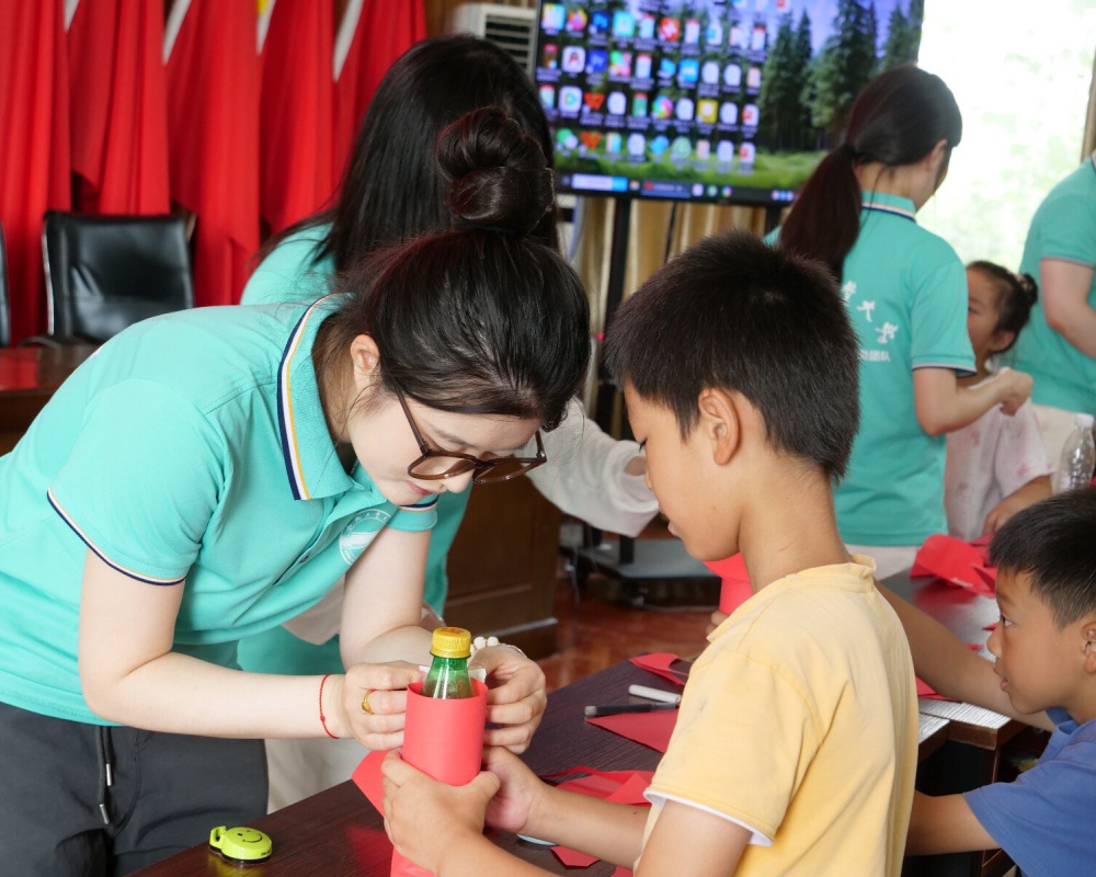 圖為團(tuán)隊(duì)成員指導(dǎo)小朋友制作小火箭 彭佳蕾攝