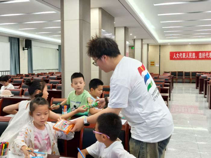 在深入調研外來務工子女需求后,團隊40名志愿者兩兩結隊開始進行主題探討、課程設計、ppt制作、物資采買等準備工作。“解鎖東方密碼——魯班鎖工程教育體驗”“精雕細琢之藝術拓印”“魅力火漆印章”“智能制造科普——大國工匠精神傳承”等20余場“七彩匠心課堂”,讓孩子們獲得了“心”與“智”的新體驗。晴山藍城社區(qū)周利書記在活動開展后表示:孩子們非常喜歡這群哥哥姐姐的到來,不僅能夠學到實用的科技知識,更能體驗到動手實踐的樂趣,為暑期體驗增添了更豐富的元素。