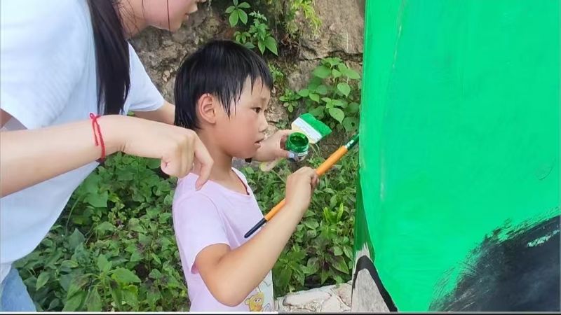 7月2日,毛坦廠鎮(zhèn)東石筍村村民李阿姨路過剛完成彩繪的村口路段時(shí),駐足向?qū)嵺`團(tuán)成員豎起了大拇指。“這電線桿上的茶葉畫得真?zhèn)魃,跟咱后山清明前采的野茶一個(gè)樣!”作為實(shí)踐團(tuán)落地的首個(gè)項(xiàng)目,帶領(lǐng)留守兒童一起墻繪,墻面彩繪活動(dòng)以“看得見的文化”為核心,將鄉(xiāng)村振興理念與本土特色深度融合。