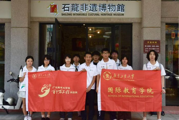 圖7: 廣東工業(yè)大學(xué)國(guó)際教育學(xué)院“數(shù)字醒獅”實(shí)踐隊(duì)在石龍非遺博物館前合影。(劉佳豪 攝)