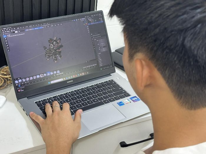 圖5: 技術(shù)組成員在工作室利用3D建模軟件精細(xì)調(diào)整醒獅模型。(陳純敏 攝)