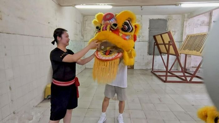 圖3: 醒獅教練丁舒姬師傅(左)向?qū)嵺`隊(duì)員詳細(xì)講解獅頭構(gòu)造的文化寓意。(歐舟 攝)
