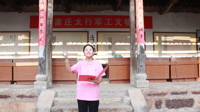 “當(dāng)?shù)谝豢|陽(yáng)光照進(jìn)窯洞車間,錘頭與鋼砧的交響便喚醒了沉睡的山谷”實(shí)踐團(tuán)成員趙怡軒的深情朗誦,如一把鑰匙打開(kāi)了楊家莊那段塵封的軍工往事,為這段紅色歷史注入了鮮活溫度。她用飽含激情的語(yǔ)言,將團(tuán)隊(duì)成員帶回那個(gè)靠信仰照亮黑夜的年代:軍工戰(zhàn)士們?cè)谟蜔粝吕L制圖紙,在寒風(fēng)中鍛造零件,用汗水與智慧凝結(jié)成保家衛(wèi)國(guó)的利器。這場(chǎng)沉浸式朗誦讓紅色記憶具象化,更在在場(chǎng)所有人心中播下了傳承的種子。