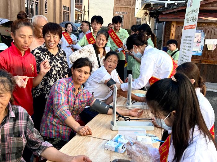 志愿者團(tuán)隊(duì)走進(jìn)武夷山五夫鎮(zhèn)五一村,有序開展義診服務(wù)。他們專注地為來到的每一位居民測量血壓、血糖,認(rèn)真記錄數(shù)據(jù)并耐心給出健康生活建議。測量結(jié)束后,志愿者們?yōu)榫用駛冑浰妥灾葡隳、艾草錘、藿香正氣水、風(fēng)油精,以及學(xué)院設(shè)計(jì)的中草藥科普扇等,將傳統(tǒng)中醫(yī)藥文化融入關(guān)懷之中。