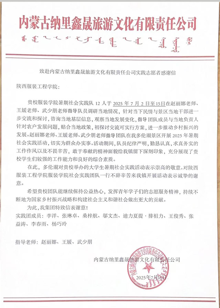 七月的多倫湖畔,青草依依,碧水含情。7月2日至7日,陜西服裝工程學(xué)院“多倫湖生態(tài)文旅賦能鄉(xiāng)村振興兼防溺水宣傳”實(shí)踐團(tuán)的青年學(xué)子,在指導(dǎo)老師趙麗娜、王媛、武少朋帶領(lǐng)下,以“青春為中國(guó)式現(xiàn)代化挺膺擔(dān)當(dāng)”為宗旨,深入內(nèi)蒙古多倫縣多倫湖風(fēng)景區(qū)及周邊村落,開展為期多天的“三下鄉(xiāng)”社會(huì)實(shí)踐活動(dòng),用專業(yè)所長(zhǎng)賦能鄉(xiāng)村發(fā)展,以實(shí)際行動(dòng)守護(hù)生態(tài)安全,在草原湖畔書寫新時(shí)代大學(xué)生的責(zé)任答卷。