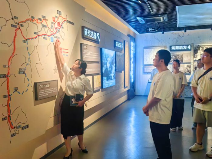 圖為樂西抗戰(zhàn)公路紀(jì)念館講解員為實踐團(tuán)隊介紹筑路歷史背景。江天一 供圖