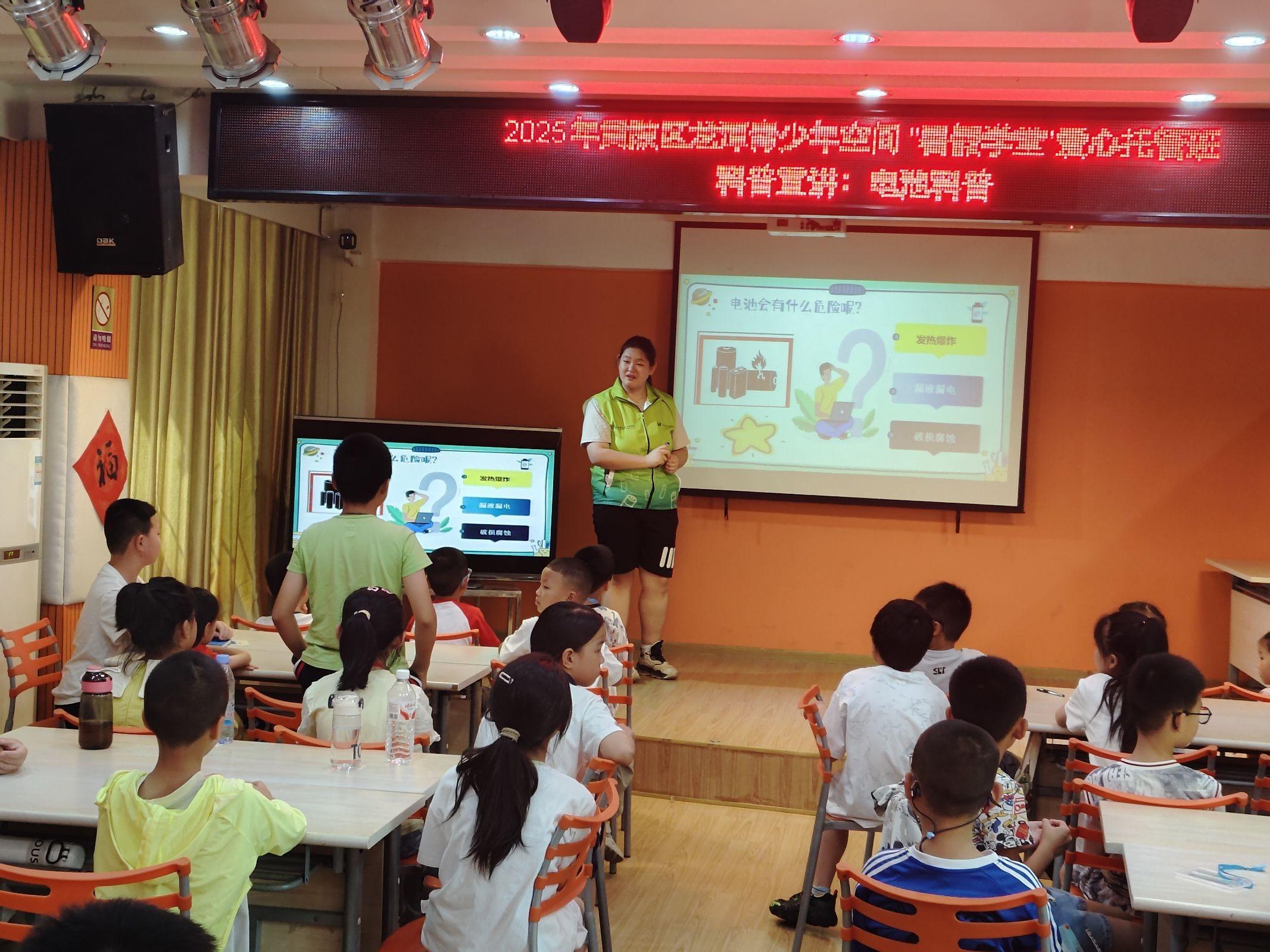 7月10日上午,實踐隊抵達黃陂區(qū)社區(qū)活動中心后,宣講環(huán)節(jié)由兩名隊員主導,其余隊員在旁輔助配合。主講隊員以“電池的秘密”為主題,結(jié)合實物展示生動講解不同電池的特點和用途,從家用遙控器里的干電池到新能源汽車上的動力電池,用生活中的例子幫助孩子們理解。講解到廢電池危害時,隊員們通過“土壤污染對比圖”“小動物生存環(huán)境”等案例,讓孩子們直觀感受隨意丟棄電池的危害。過程中,輔助隊員適時舉起對應電池實物配合展示,還不時用眼神和手勢與主講隊員互動,提示調(diào)整節(jié)奏,確保孩子們聽得懂、感興趣。