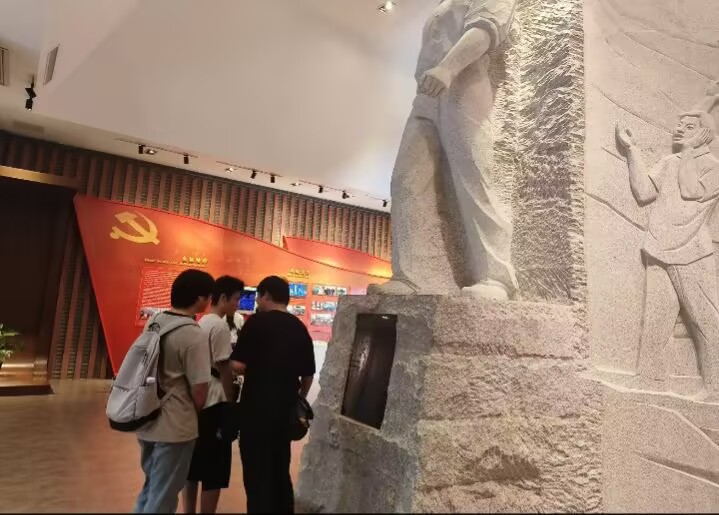 實踐首站,團隊成員懷著崇敬之心踏入了這座承載著中國農(nóng)村變革起點的大包干紀念館。館內(nèi),栩栩如生的歷史場景雕塑,再現(xiàn) 了小崗村十八位農(nóng)民按下“紅手印”、簽訂“生死狀”的壯舉瞬 間。展柜中陳列的泛黃的契約書原稿,是中國農(nóng)村命運改變的關(guān) 鍵見證;墻上珍貴的歷史照片與詳實的領(lǐng)導人視察資料,無聲訴 說著從“大包干”星火到燎原神州大地的波瀾壯闊歷程。同學們 凝視著文物,用鏡頭定格這些承載著民族記憶的文物。最后,實 踐團全體成員在紀念館前合影留念。而身后,“大包干紀念館”幾個大字,也定格了青年學子追尋初心的堅實一步。